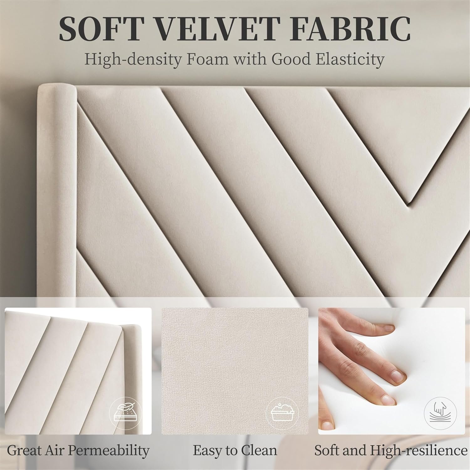 Wing Side Design: Designed with a wing side on the wide upholstered headboard and skin-friendly velvet fabric, the queen bed frame can be a must-have in any restful retreat. (No Box Spring Needed)